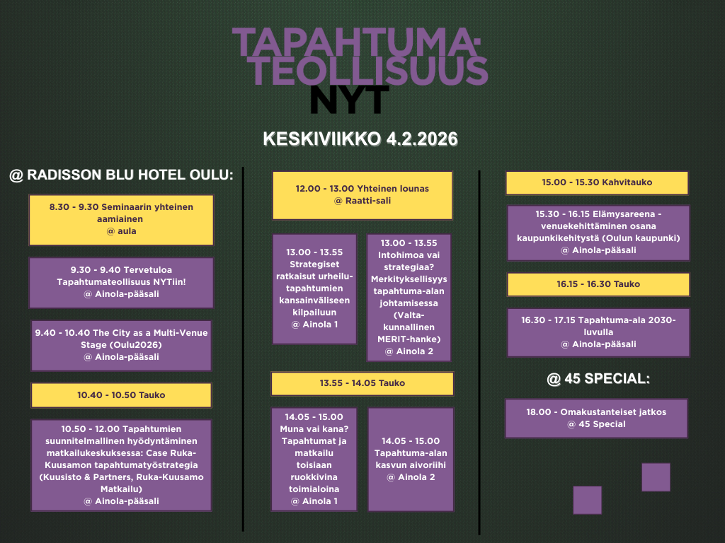 Toimialaseminaari alkaa tiistaina 3.2.2026 yhteisellä iltaohjelmalla ja itse seminaariohjelma järjestetään yksipäiväisenä keskiviikkona 4.2.2026.